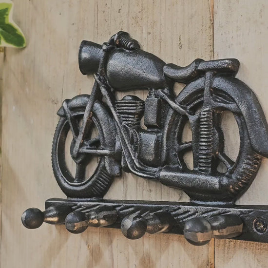 Cast iron wall mounted motorcycle featuring 4 hooks. Ideal for keys.