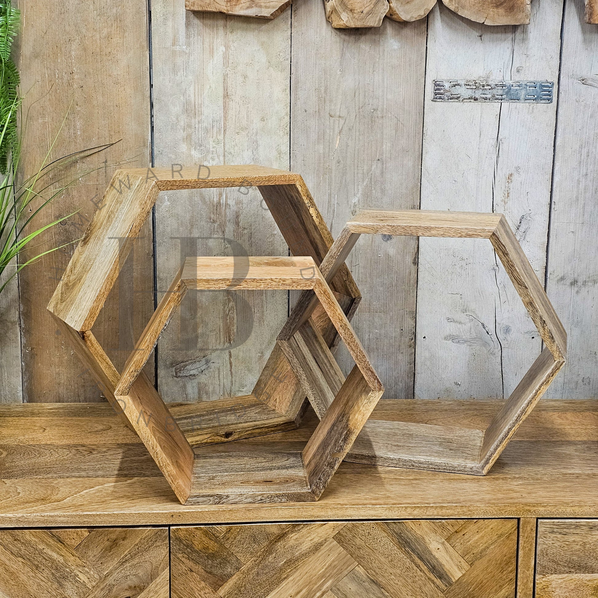 This set of solid mango 'floating' hex shelves can be hung in any configuration.