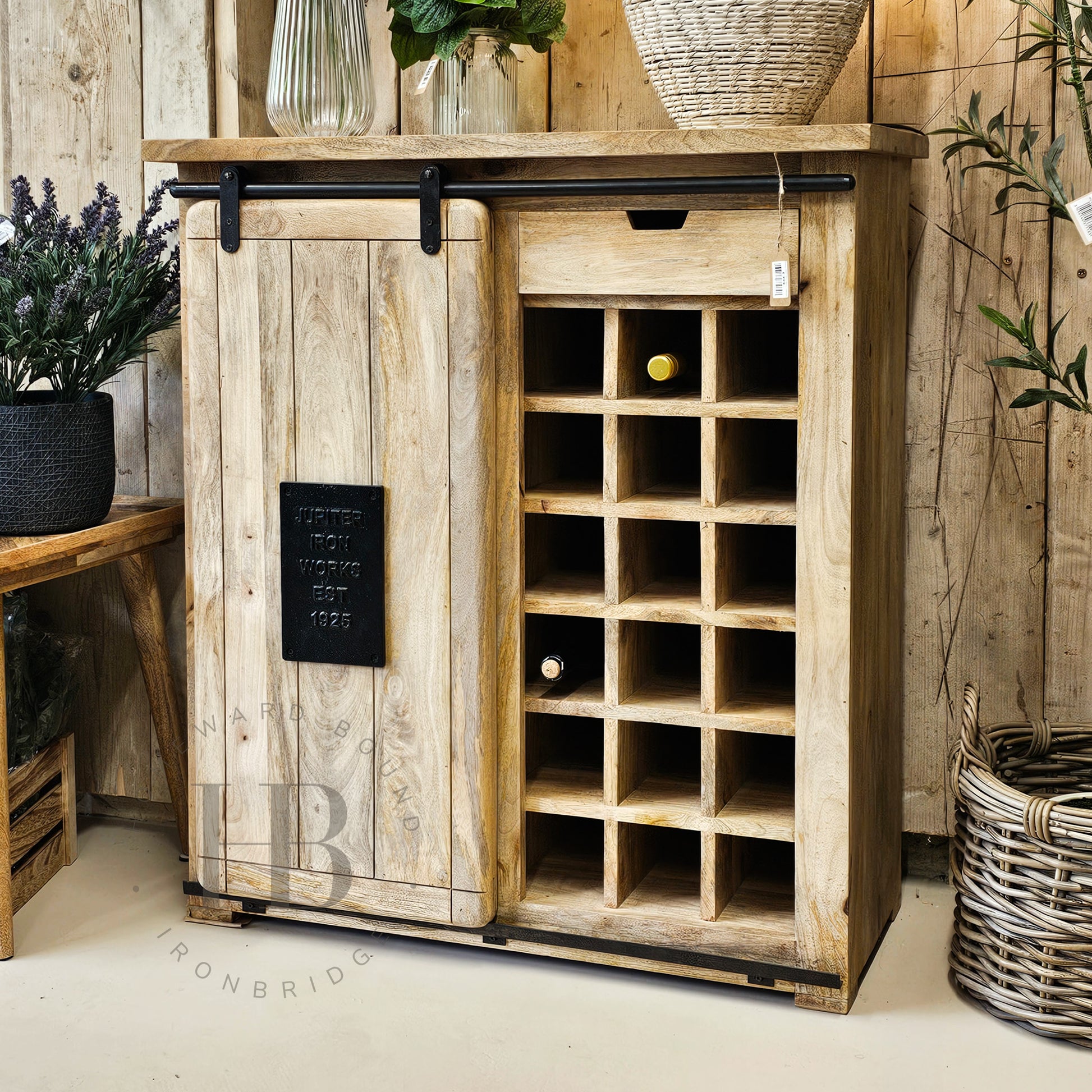 This stunning, rustic mango cabinet features space for 18 bottles of wine, a small drawer, and a large cupboard with a shelf.