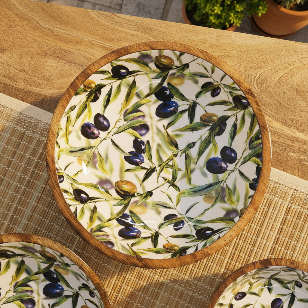 Made of versatile mango wood, and finished with an 'Olive Grove' enamel pattern, these bowls are easy to wipe clean.