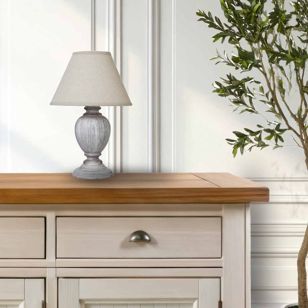 This small lamps distressed base and linen shade exude timeless charm, while its unique urn silhouette lends an artisanal quality. Versatile for diverse interior styles, this captivating piece is a must-have lighting solution.