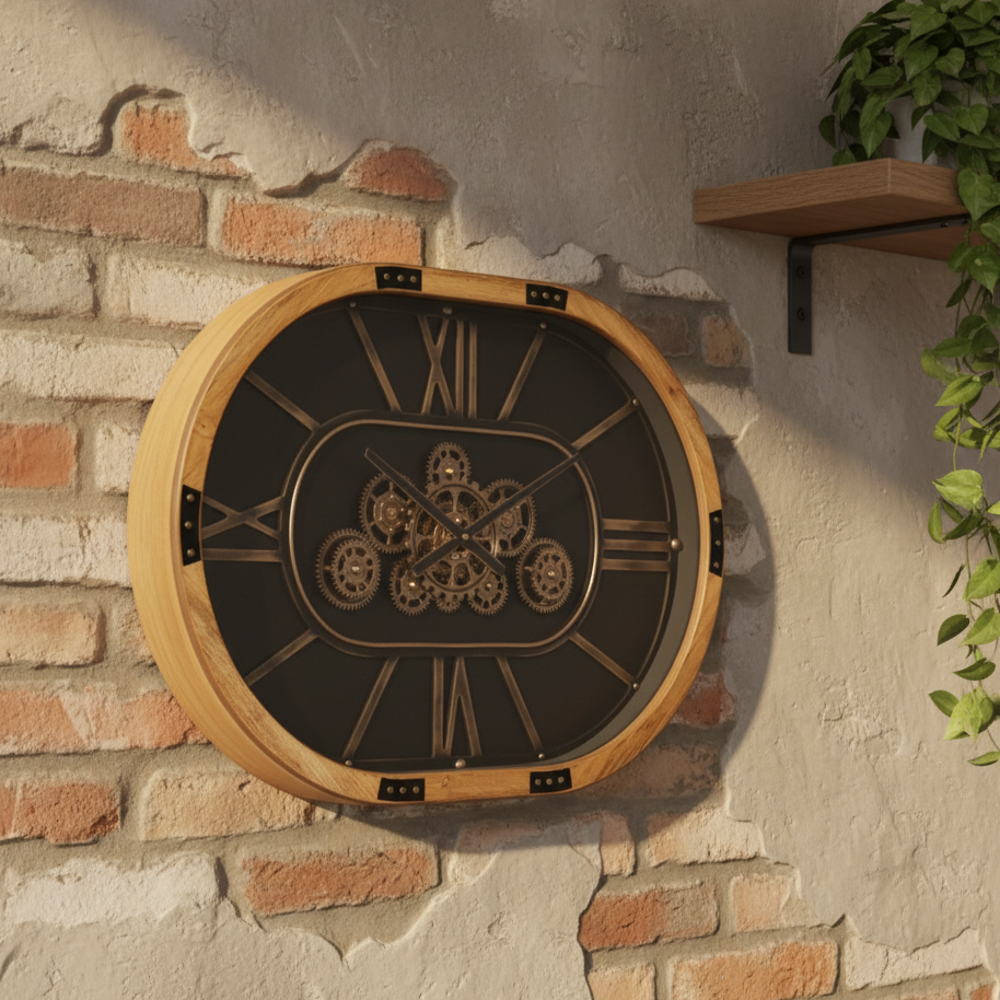 These striking clocks make a real statement with a set of cogs gently turning in the centre.